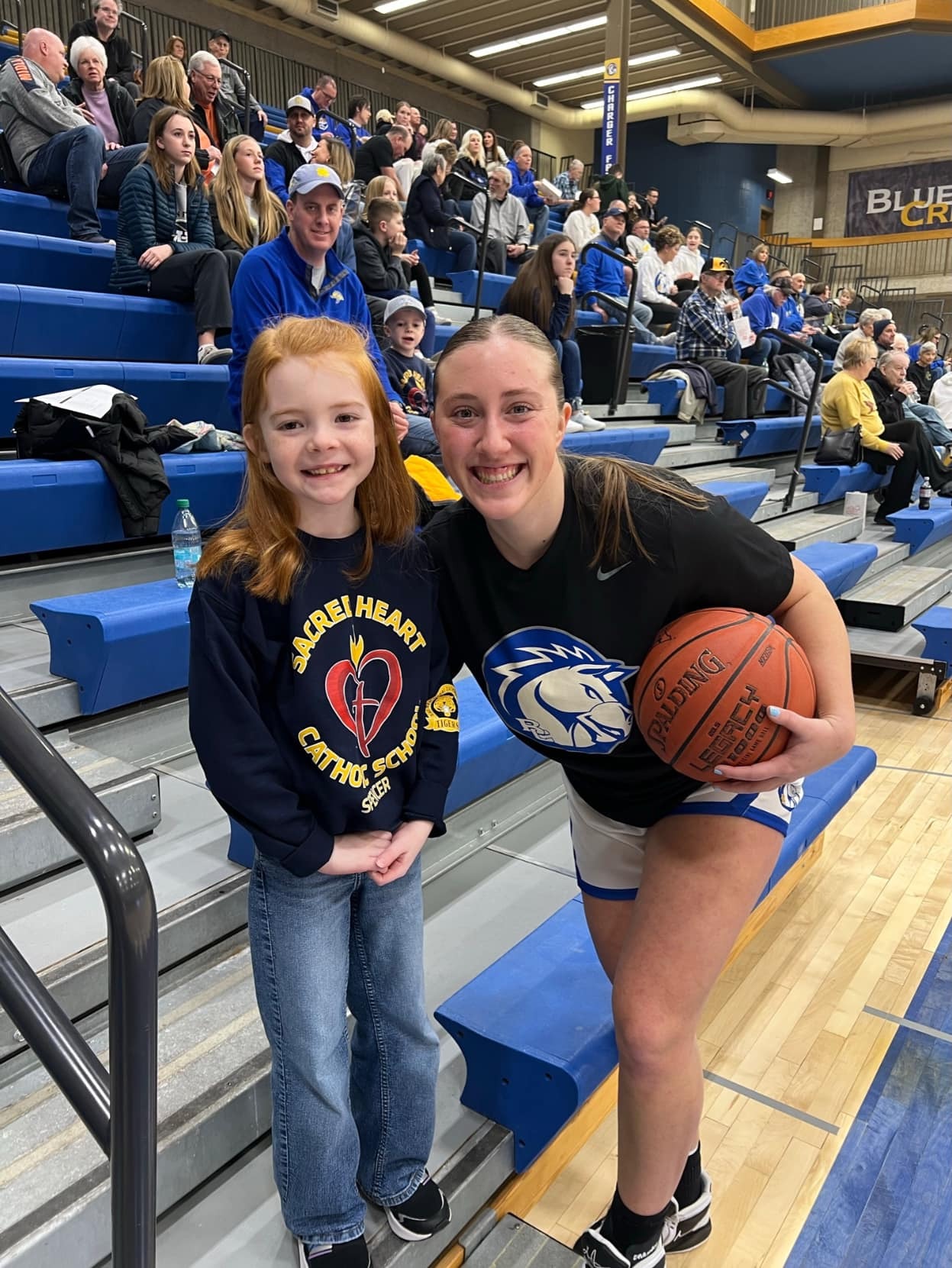 At the game, Sikora had the opportunity to meet Kylie Sanger, her college pen pal, in person—an experience that highlights the mentorship and lasting connections that grow within Catholic education. Briar Cliff students in various programs, including education and social work, connect with students for the pen pal program from Sacred Heart School in Spencer and St. Mary’s Catholic School in Humboldt.