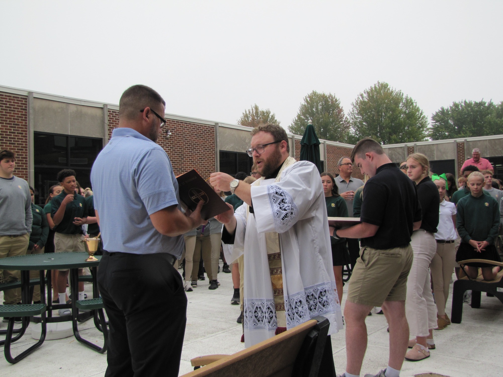 Father Jake Rosenmeyer, chaplain, prepares for the blessing of the St. John Bosco statue at St. Edmond School this week. They also enjoyed the prospect of being able to spend time outside, digging in the dirt and eventually studying or just chatting with other students in the new courtyard.