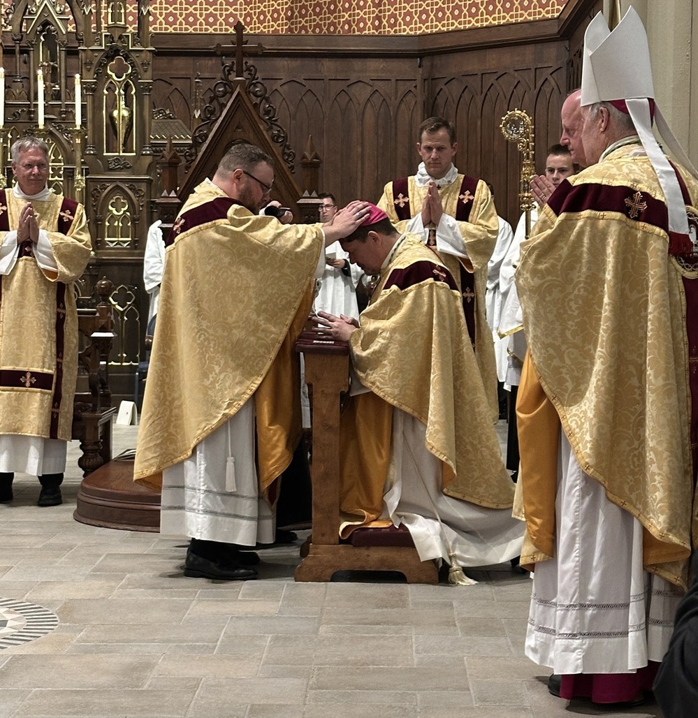Kneeling before Bishop Keehner, Deacon Rosenmeyer pledged his obedience to the current bishop and his successors. He then prostrated himself before the altar while the Litany of Saints was chanted. The deacon returned to kneeling before the bishop for the laying on of hands in silent prayer. While the choir chanted Veni Creator Spiritus, the priests in attendance took their turns to place their hands on the deacon’s head and offer their prayers.