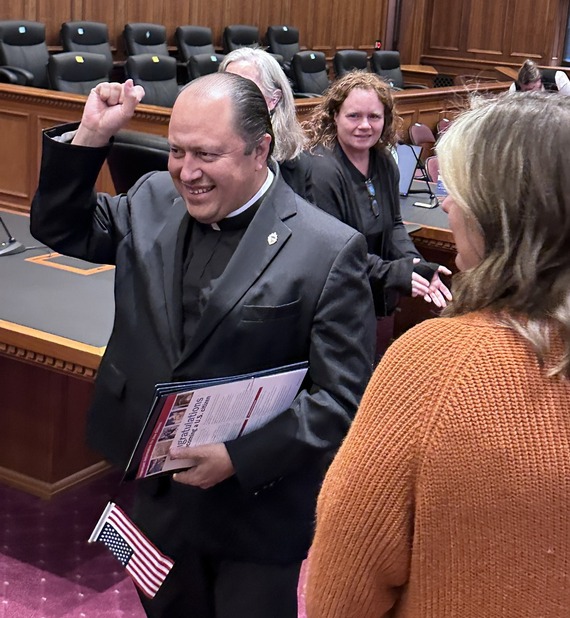El 21 de junio de 2019 regresé a Estados Unidos y me convertí en residente permanente. Fue también cuando comencé mi asignación aquí en la Catedral. Un par de años después me nombraron Vicario Judicial de la diócesis. En diciembre de 2024, habiendo cumplido los cinco años de residencia requeridos, me puse en contacto con el programa Welcome de Catholic Charities de la Diócesis de Sioux City y pedí su ayuda para solicitar la naturalización. Con su apoyo presenté la documentación, y el 10 de octubre aprobé el examen requerido de educación cívica e inglés. Luego, el viernes pasado, hice mi juramento como ciudadano de este gran país. Ha habido momentos difíciles en este camino: momentos en los que incluso le pregunté a Dios si realmente me quería aquí, en el noroeste de Iowa; relaciones difíciles con algunas personas; no poder estar con mi familia en momentos duros, como la muerte de mi papá o de mi prima Jazmín; momentos en los que me he sentido rechazado por mi lugar de origen. Pero Dios siempre ha encontrado maneras de asegurarme que Él me llamó aquí y que aquí es donde me quiere. Hacerme ciudadano es a la vez un signo de ese llamado y un fruto de los muchos signos que he recibido a lo largo del camino. He dicho antes que me siento bendecido de ser un párroco inmigrante de nuestra parroquia, que sigue siendo en gran medida una comunidad inmigrante de clase trabajadora en la diócesis. Ser inmigrante me ayuda a apreciar las dificultades que muchos de nuestros feligreses viven, aunque, a diferencia de muchos de ellos, yo he tenido la bendición de contar con el apoyo de la diócesis. Y, para quienes no lo saben, eso también significa que la diócesis ha gastado miles de dólares para apoyarme con los gastos legales de inmigración.
