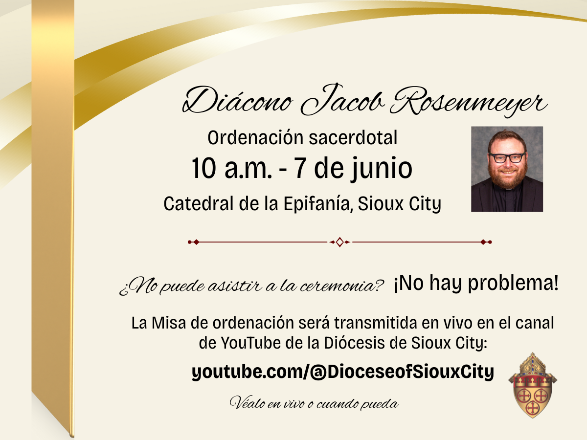 Deacon Jacob Rosenmeyer of Divine Mercy Parish, Kossuth County and West Bend, will be ordained a priest on June 7 at 10 a.m. at the Sioux City Cathedral of the Epiphany at 1000 Douglas Street. All are welcome.