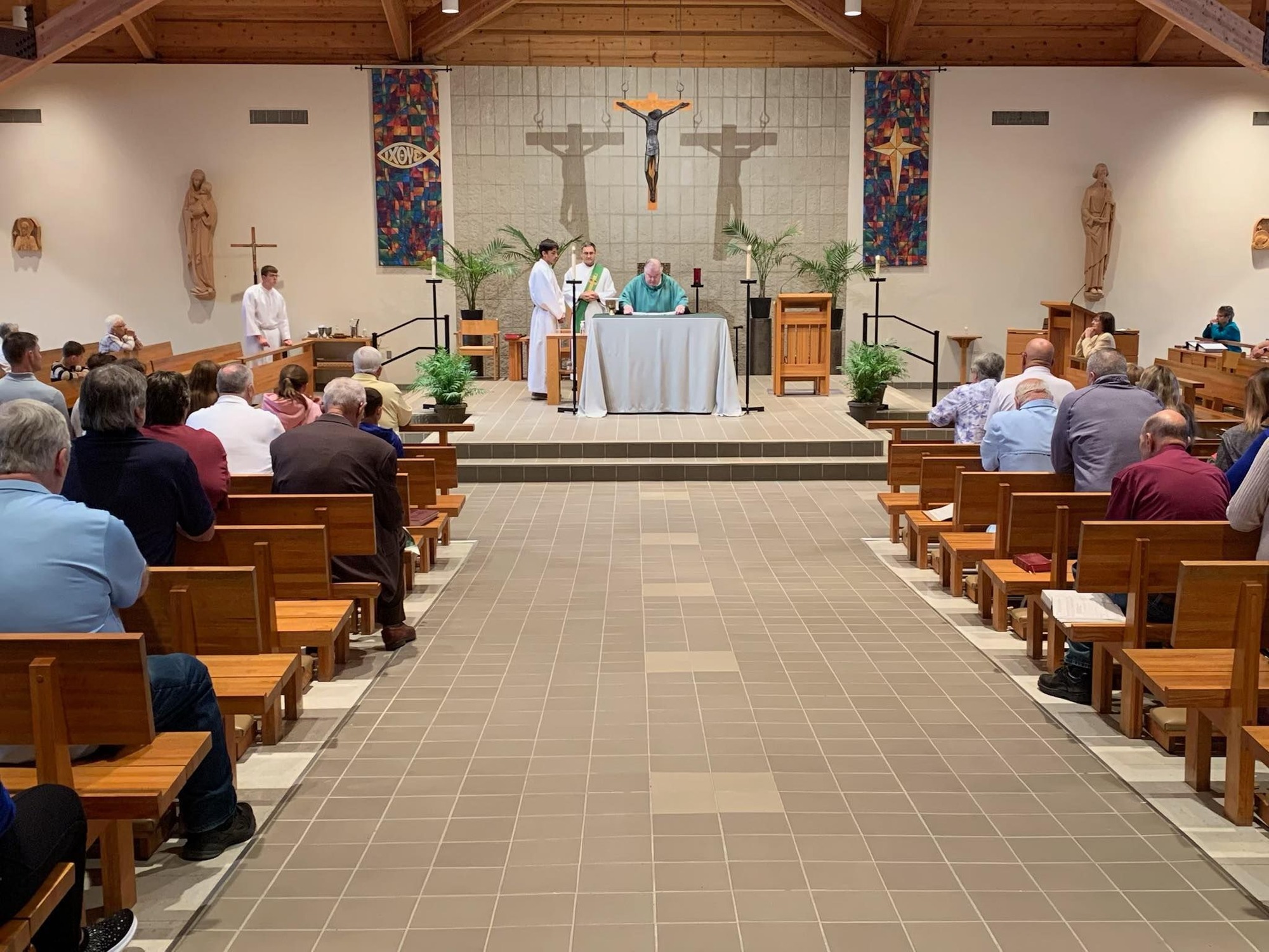The statues are 6 feet tall and hand carved out of linden wood by the Demetz Art Studio in Italy. They arrived on Sept. 19, 2025 and were blessed on Oct. 5 at the 8 a.m. Mass by Father Tim Friedrichsen, pastor.