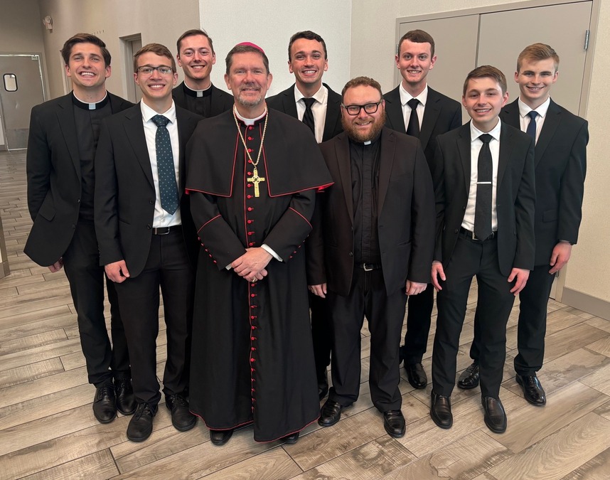 Bishop Keehner and Father Jake Rosenmeyer with seven current diocesan seminarians. “It’s like the universal church coming together all here for this moment. That’s such a cool thing for me to witness, to be there and in it. It was just amazing,” Kahle said.